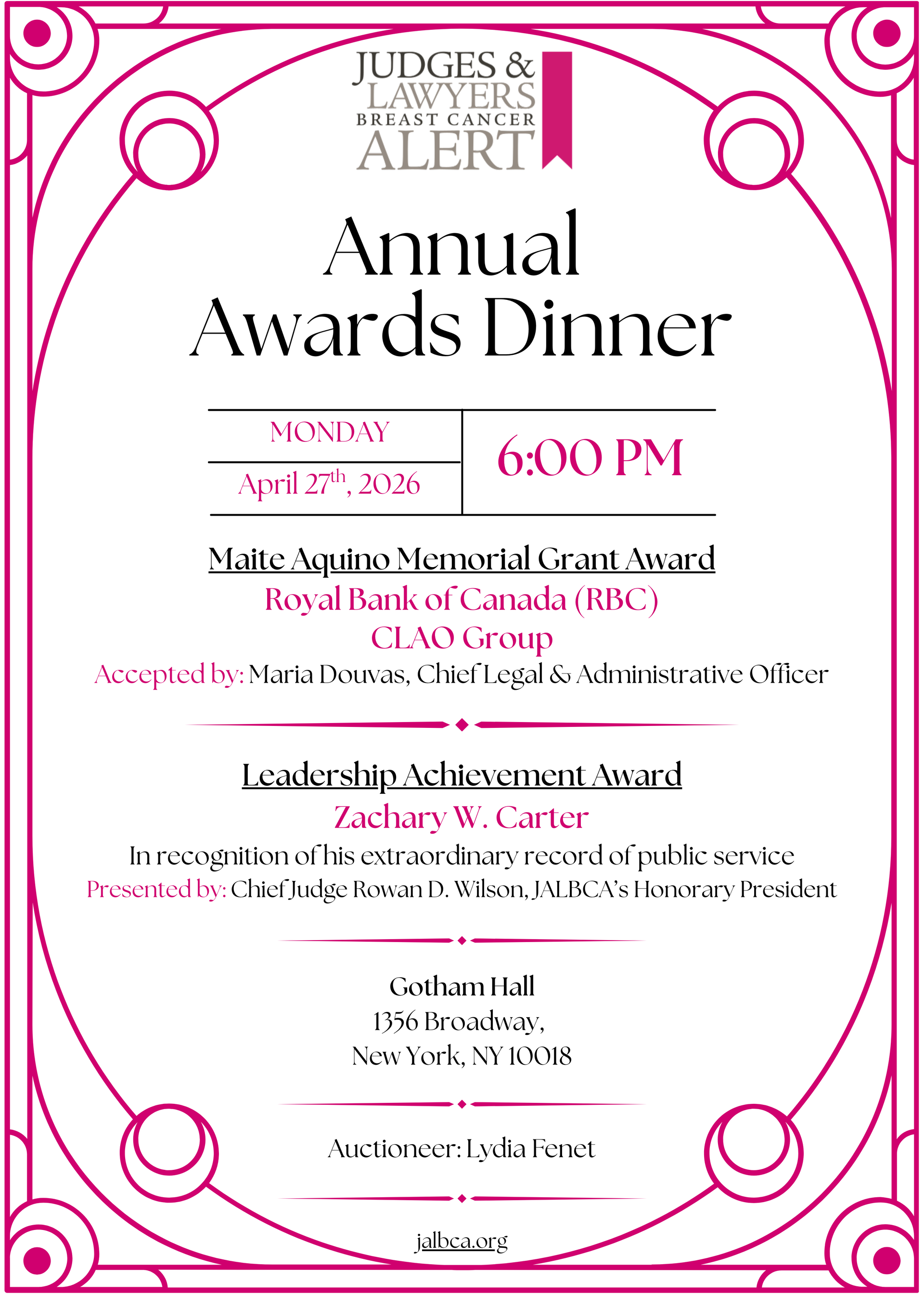 JALBCA's Annual Awards Dinner is held every year in April or May with the mission to raise funds for providing grants to various nonprofit organizations in the Tri-State area, to support legal and social services to cancer patients and their families, particularly those who could not otherwise afford them, as well as education and training efforts and early detection initiatives. Each year, the Maite Aquino Memorial Grant Award is presented to a recipient in the private sector, and the Leadership Achievement Award is presented to a recipient in the public sector. The Volunteer Service Award is given to recognize volunteers for their outstanding dedication and service to support JALBCA's mission.