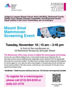 Judges & Lawyers Breast Cancer Alert (JALBCA), Richmond County Family Court Gender Fairness Committee, and Richmond County Equal Justice in the Court Committees, are co-hosting a Mount Sinai Mammovan Screening Event The Mammovan offers easy access to digital 3D mammogram technology, and we also use artificial intelligence for a more precise breast cancer diagnosis. We can also…