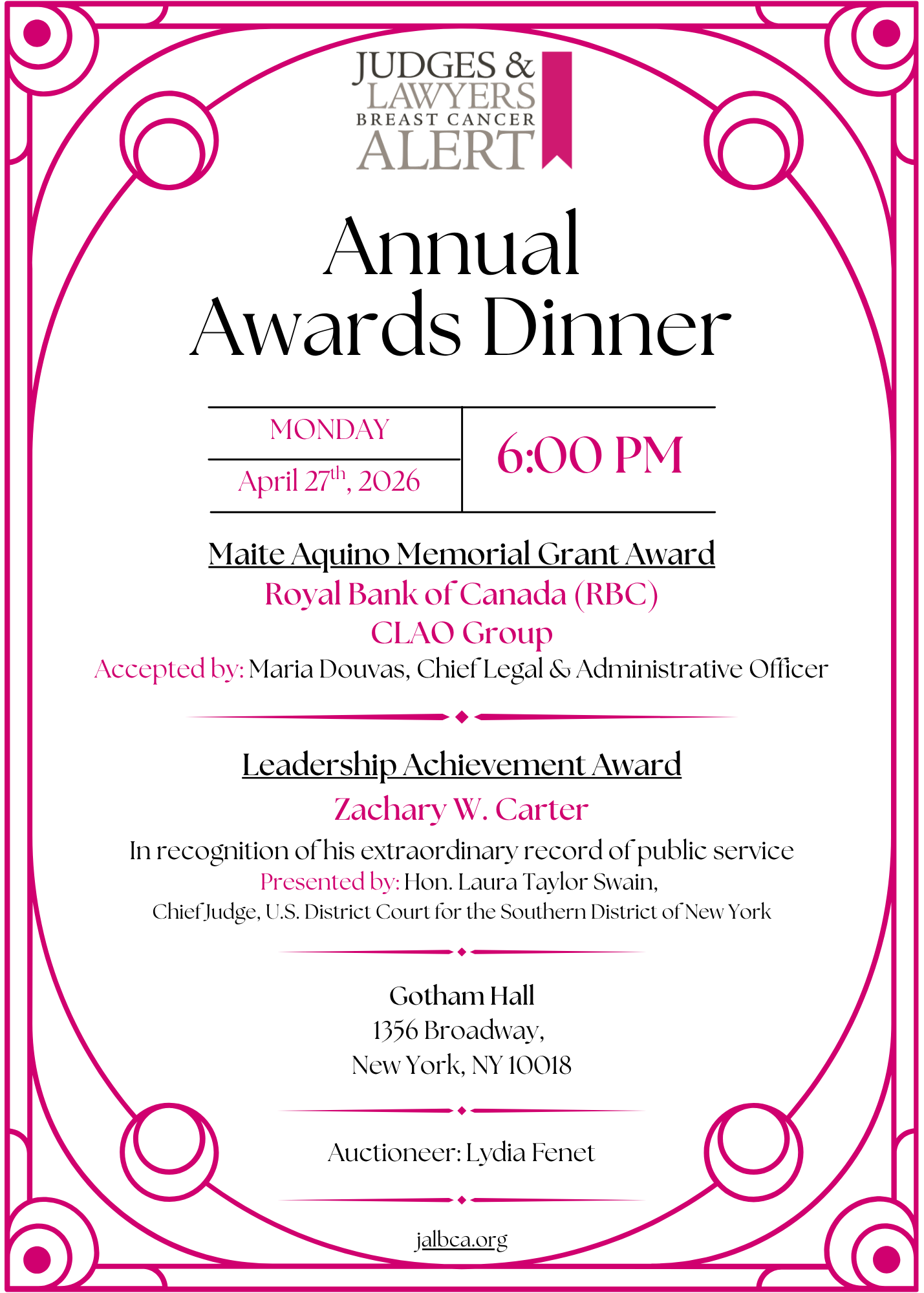 JALBCA's Annual Awards Dinner is held every year in April or May with the mission to raise funds for providing grants to various nonprofit organizations in the Tri-State area, to support legal and social services to cancer patients and their families, particularly those who could not otherwise afford them, as well as education and training efforts and early detection initiatives. Each year, the Maite Aquino Memorial Grant Award is presented to a recipient in the private sector, and the Leadership Achievement Award is presented to a recipient in the public sector. The Volunteer Service Award is given to recognize volunteers for their outstanding dedication and service to support JALBCA's mission.